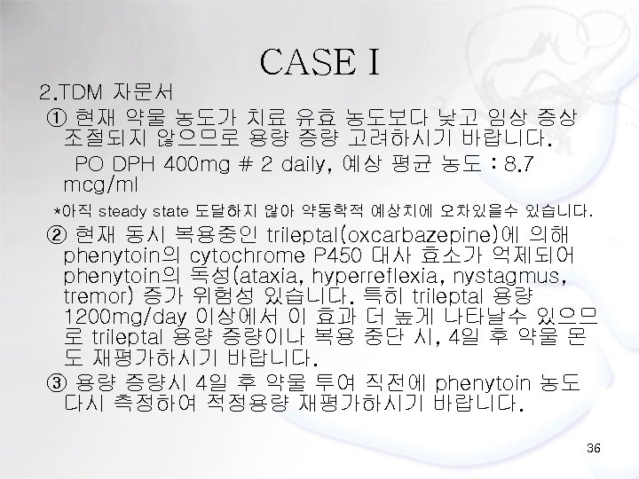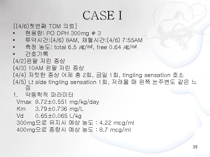 CASE I • • K. S. M/48, 161 cm/65 kg 진단명: lymphoma, malignant, CNS GOT/GPT: 26/55, albumin 4. 4 • Progress note C. C: 왼쪽 반신이 저리고 머리가 멍한 느낌 p. Hx: no DM/HTN/pul. Tbc/hepatitis Alcohol : 소주 1 -2병/주 상기증상 하루에 1 -3회 반복, 타 병원 R/O CJD(Creutfeldt-Jakob disease), further evaluation위해 내원 (4/1)PET상 CJD보다는 tumor 가능성 높음 (4/2)phenytoin loading 1000 mg # 3후 daily 300 mg # 3, 저린 증상 3차례 (4/3)phenytoin투여 후 Sx 현저히 subside • 투약력 (4/2) PO phenytoin(이하 DPH) 300 mg 1 PM, PO DPH 400 mg 6 PM (4/3) PO DPH 300 mg 8 AM (4/3 -4/20) PO DPH 300 mg # 3 daily, (4/20)부터 PO DPH 400 mg # 2 daily • Comedication Trileptal 600 mg 34