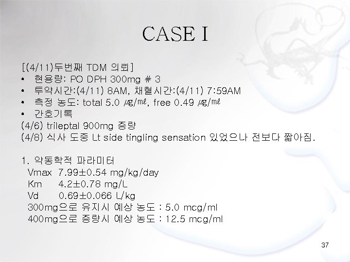 CASE III 1. 약동학적 파라미터 Total Vd Vmax ESRD 보정시 농도 0. 66± 0. 06 L/kg 0. 63± 0. 06 L/kg 10. 9± 0. 56 mg/kg/day 6. 02± 0. 83 mg/kg/day Km 3. 75± 0. 74 mg/m. L 약물 예상 2. 6 5. 9 농도 치료 유효 농도 Free 계산시 4. 4 -8. 8 4. 1± 0. 81 mg/m. L 11. 4 10 -20 46