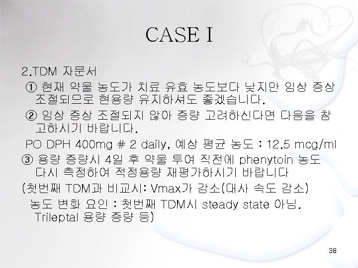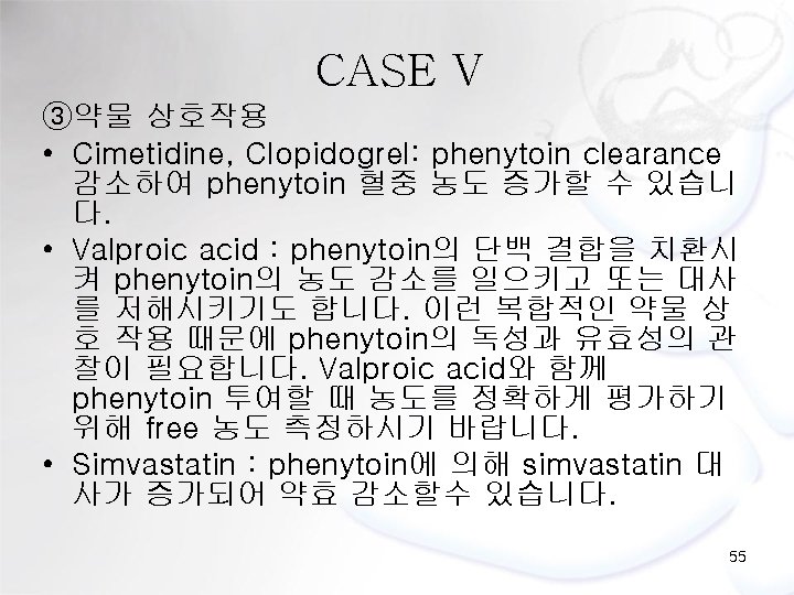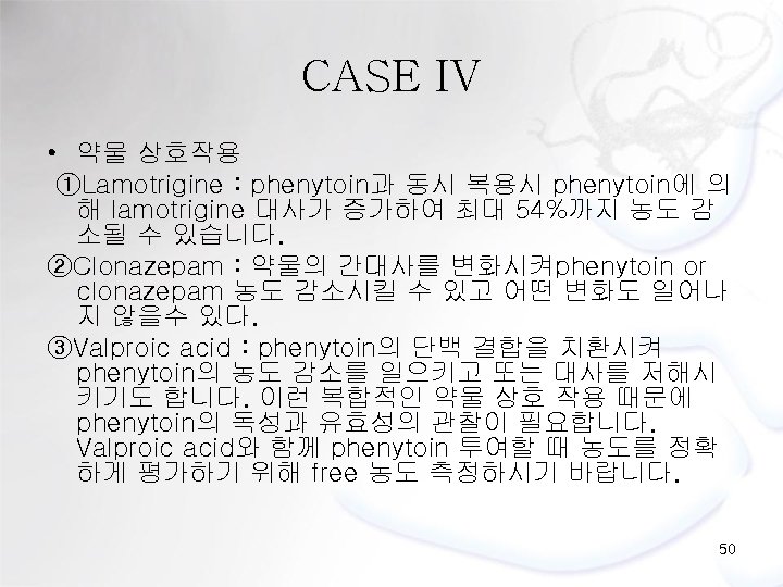 CASE IV • 투약력 자가약 PO Phenytoin(이하 DPH) 300 mg # 2(1 -2 C) daily • Comedication Lamictal(lamotrigine), trileptal(oxcarbazepine), Rivotril(clonazepam) (3/19) valproic acid 3/9 3/14 3/22(vpa 농도: 45. 3) Total 농도 7. 6 1. 8 5. 7 Free 농도 0. 69 0. 19 1. 07 Albumin 4. 6 3. 6 보정 농도: 8 49
