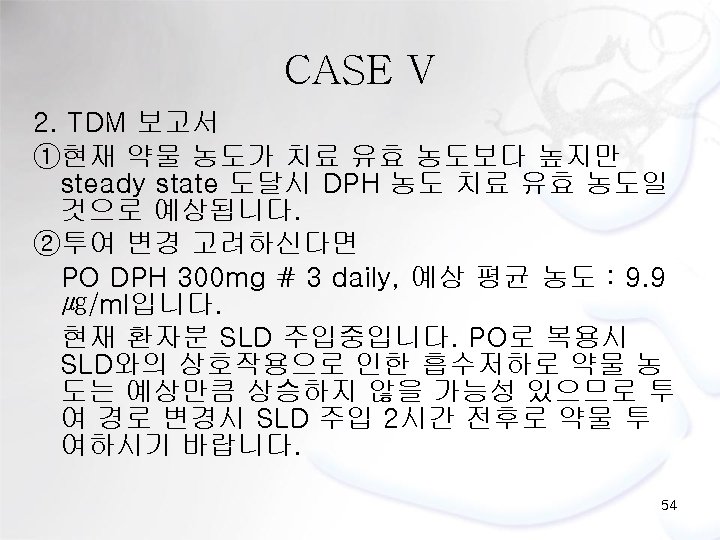 CASE V 1. 약동학적 파라미터 Total Vd Vmax Albumin 보정시 농도 0. 65± 0. 06 L/kg 7. 25± 0. 57 mg/kg/day Km 3. 97± 0. 78 mg/m. L 약물 예상 5. 6 7. 6 농도 치료 유효 농도 7. 3 -14. 6 Free 계산시 0. 63± 0. 06 L/kg 5. 8± 0. 61 mg/kg/day 4. 12± 0. 82 mg/m. L 10. 7 10 -20 53