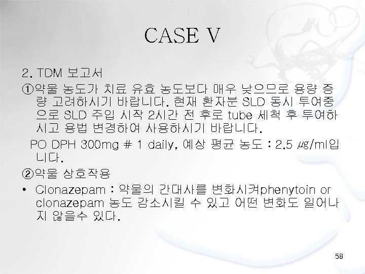 CASE V 1. 약동학적 파라미터 Total Vd Vmax Albumin 보정시 농도 0. 67± 0. 06 L/kg 9. 54± 1. 5 mg/kg/day Km 3. 24± 0. 59 mg/m. L 약물 예상 1. 34 1. 78 농도 치료 유효 농도 7. 5 -15 10 -20 57