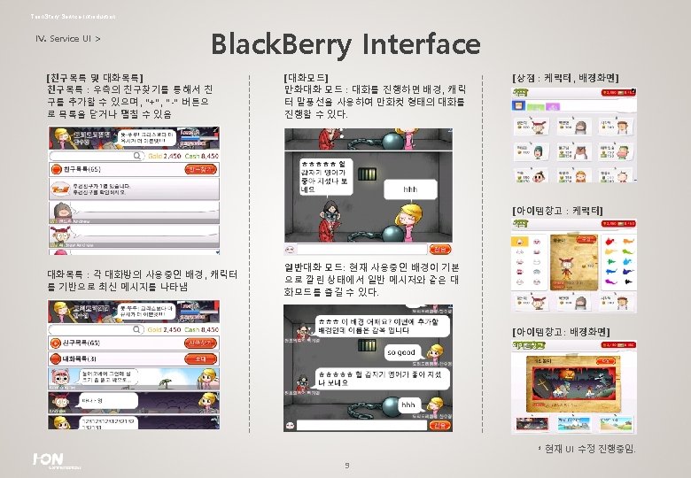 Toon. Story Service Introduction System 구성 V. System 구성 > 외부 연동 Toon. Story System 서비스 DB 채팅 DB PUSH DB 서비스 Server 채팅 Server PUSH Server (IPNS) SMS 연동 IAP, Pay. Pal, PG [비즈니스 로직 관리] 로그인, 회원정보 관리, 상점 Admin 티저사이트 사용자 Web 제휴사 [채팅 관리] 친구목록, 친구 찾기, 레벨, 경험치, 골드, 캐시, 대화저장 발송여부 체크 APP 외부 SNS 연동 Toon. Story Client 블랙베리 APNS PUSH 발송, PUSH 서버 연동 , 랭킹, 편지함, 설정 등 WEB [PUSH 관리] 채팅, 대화목록 뺏지, 안드로이드 • IPNS : I-ON Push Notification Service, 10 아이폰 APNS : Apple Push Notification Service, IAP : In App Purchase