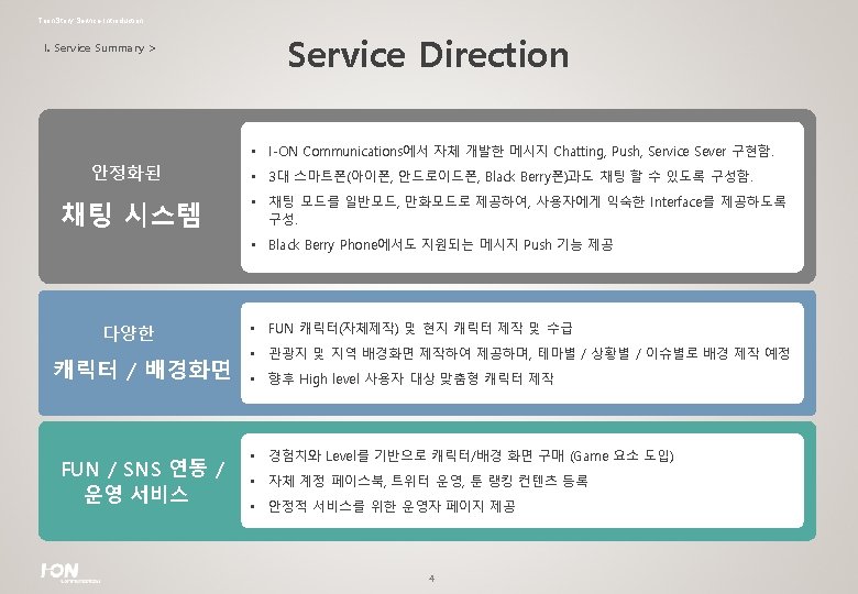 Toon. Story Service Introduction Service Plan I. Service Summary > STEP 1(2012) STEP 2(2012 4 Q) 주요기능 Mission Plan Fun and Emotion • • 사용자 감성의 캐릭터 발굴 및 공급 이용자 Lock in FUN 서비스 발굴 App 최적화(Network 연동 최소화) Goal 달성을 위한 BM 발굴 SNS Game, Soft SNS Platform Talk Messenger • 이용자 감성을 자극하는 Sensitive Talk 오픈 • 타 사업자와 연동이 가능한 Open Platform 구축 STEP 3(2013~) • Communication HUB Platform 오픈 • m-SNS 서비스 구현 • • • App To Web 서비스 개발 Talk Education • SNS 기반 서비스 및 BM 확장 개인화 서비스 강화 타 플랫폼과 연동이 가능한 API 개발 추가 BM 모델 발굴(광고 등) 제휴 관계 확장 해외 서비스 현지화 작업 • Chatting system • SNS Contents maker • Toon Character / Background • Ranking Service • Push system • Facebook Upload • Selling Point(cash) • Web<->App Platform • Emotion Function (weather, Smart phone Sensors) • News Feed Web<->App service • • Wall Service • Communication Channel Addition 3 • TCGame (Trading Card Game) • Character Messenger Education