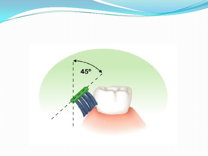 Continued…… �The bristles ends are placed at 45 degree with the bristles directed apically on the gingiva and partly on the cervical portion of the tooth �when the bristles are in position a gentle but firm vibratory motion is applied to the brush with the bristles remaining in the same position
