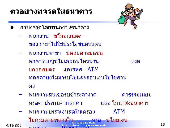 About CFE Exam l l l Covers 4 areas – Criminology & Ethics – Financial Transactions – Fraud Investigation – Legal Elements of Fraud 4 Exam sections of 125 questions each (75%) Administered via computer / must complete each section in one sitting (2. 6 hr) Complete all and return to ACFE in 30 days Must pass Qualifying Points System (40/50) $250 Application Fee 4/11/2563 Top 10 Banking Fraud ไพรช ศรวไลฤทธ pairat@tisco. th 60