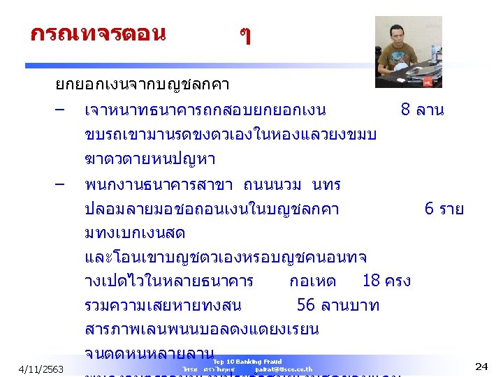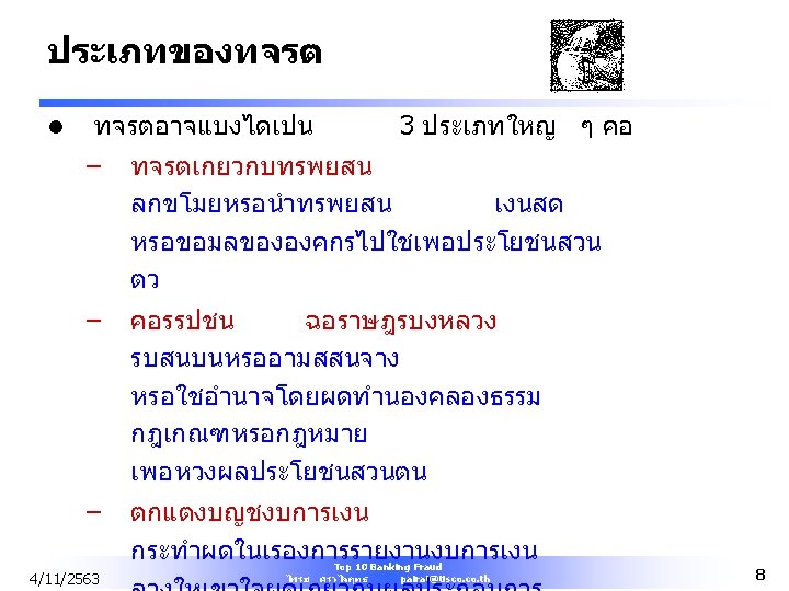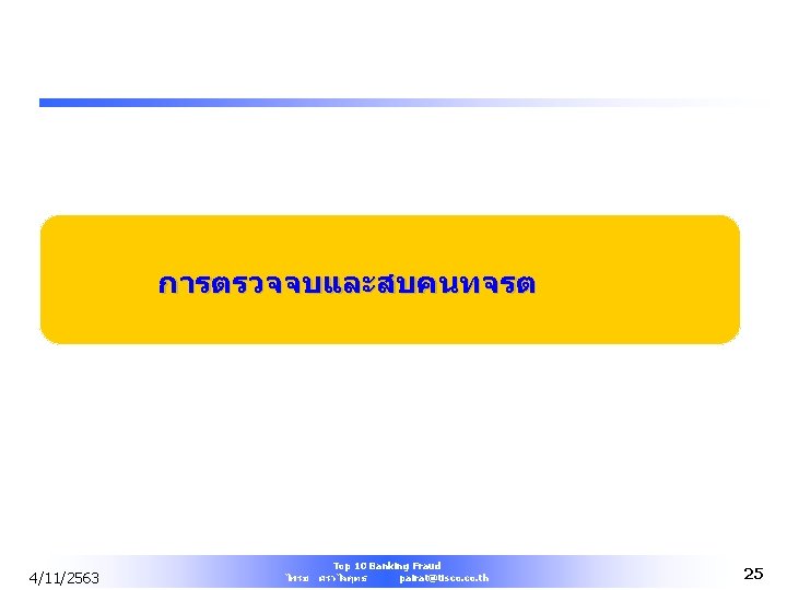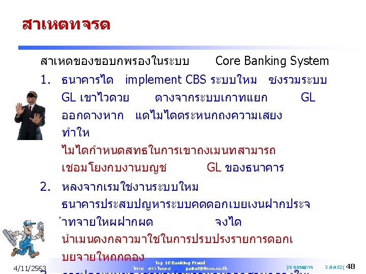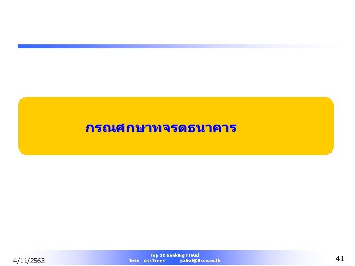 Bank Most Common Fraud l Greatest percentage (15%) of fraud occurred in banking and financial services sector. 4/11/2563 Top 10 Banking Fraud ไพรช ศรวไลฤทธ pairat@tisco. th 10