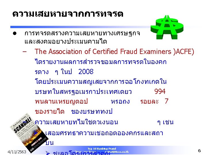 About the ACFE l l l The Association of Certified Fraud Examiners Start 1988 Provide anti-fraud training and education Over 50, 000 members in 125 countries Administrate the Certified Fraud Examiner (CFE) designation- a certification program for fraud practitioners recognized by U. S. Department of Defense and FBI More than 20, 000 CFE’s worldwide (5 Thais) $55 Membership Fee l More information about ACFE l http: //www. acfe. com 4/11/2563 Top 10 Banking Fraud ไพรช ศรวไลฤทธ pairat@tisco. th 59