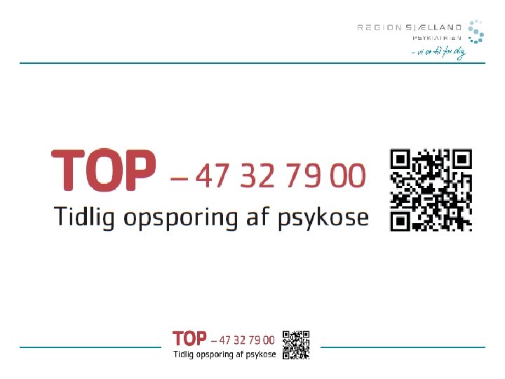TOP-kampagne 2012 -2013: • • • Helsides annoncer i lokalpressen Bannerannoncer Regionens hjemmeside Tv-spots til pårørende TV 2Øst Film-spots i 16 lokale biografer til unge Radiospots i tre største lokalradioer 5 busbagsider i Roskilde og Køge Informationsmateriale: postkort, foldere, visitkort Redskaber til praktiserende læger: Screeningsredskab, kubusblokke, kuglepenne, USB-stik med undervisningsmateriale Hjemmesiden www. regionsjaelland. dk/top Facebook-side www. facebook. com/TOPhotline You. Tube kanal med filmspots Praksis-info