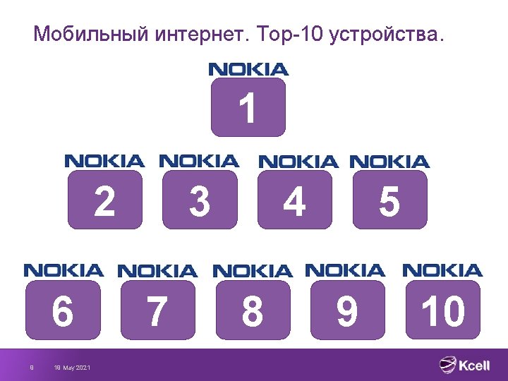 Мобильный интернет. Top-10 устройства. 1. Nokia 2700 c 2. Nokia 5130 Xpress. Music 3. Nokia 6300 4. Nokia 6303 i classic 5. Nokia X 2 6. Nokia 6303 c 7. Nokia 6700 c 8. Nokia 5310 Xpress. Music 9. Nokia 2690 10. Nokia 2730 c 10 19 May 2021