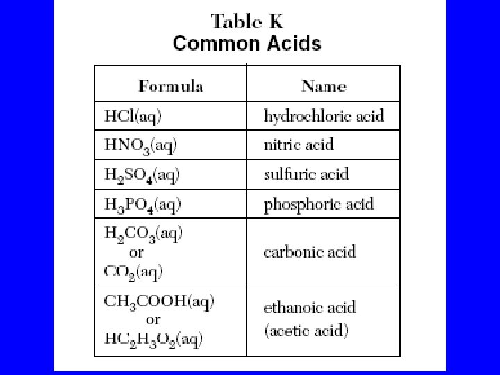 TABLE M common acids • • HCl(aq) hydrochloric acid HNO 3(aq) nitric acid H 2 SO 4(aq) sulfuric acid H 3 PO 4(aq) phosphoric acid H 2 CO 3(aq) carbonic acid CH 3 COOH(aq) ethanoic acid HC 2 H 3 O 2(aq) (acetic acid)