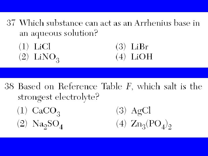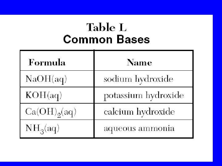 Table L Common Bases • Formula • • Na. OH(aq) KOH(aq) Ca(OH)2(aq) NH 3(aq) Name sodium hydroxide potassium hydroxide calcium hydroxide aqueous ammonia
