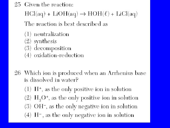 Acids • Taste sour • Corrosive • React with some metals to produce H 2 • Change Litmus to red acid= red • React with bases to form water and salt. Bases • • Bases taste bitter Feel slippery Corrosive Change Litmus to blue base = Blue • Become less basic when mixed with acids.