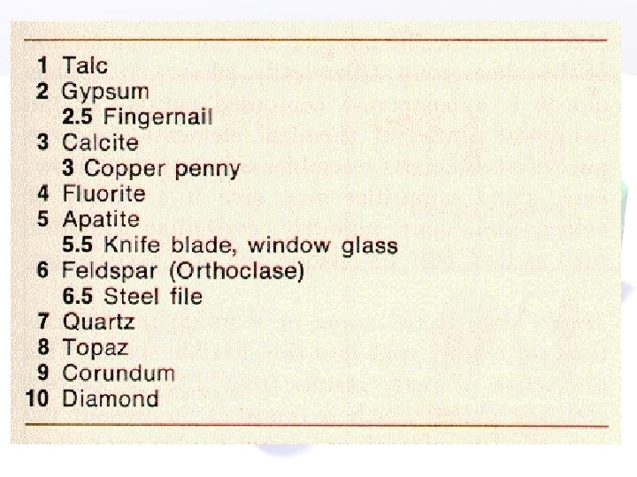 4. Hardness • • • The ability of a mineral to resist being scratched. “Scratch test” If mineral A can scratch mineral B, what does that tell us about the relative hardness of each mineral?