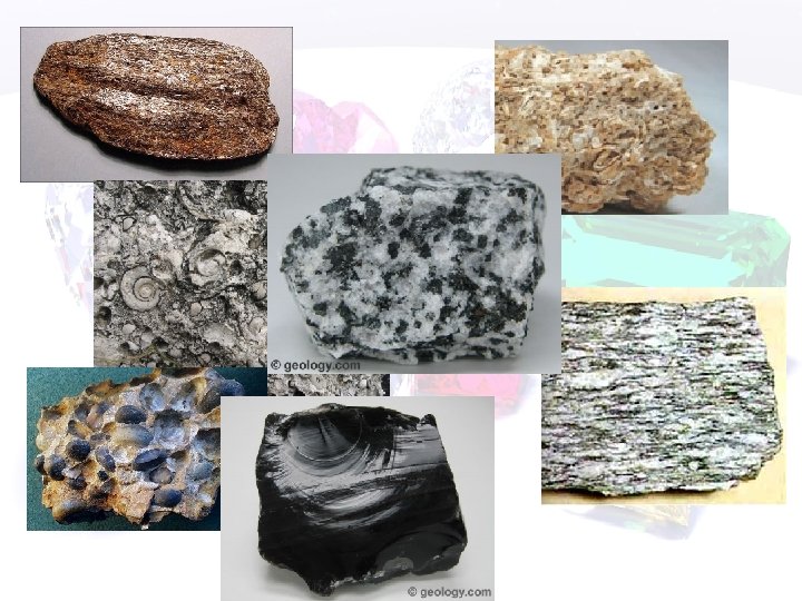 Identifying Characteristics of Rocks Igneous • Intergrown crystals • Glassy texture Metamorphic • Banding • Foliated Sedimentary • Cemented fragments (sediments) • Fossils • Organic material