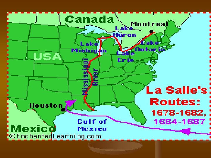 La Salle’s 2 nd Expedition La Salle’s Second Expedition c. i. iii. iv. In need of help, he leads a small group to search for the Mississippi River. His goal is to travel north to Canada and find help at French settlements there. He ventures into east Texas (some say near Navasota) and is later murdered by his own men (they were fed up!) Some of these men made it to Quebec and eventually back to France.