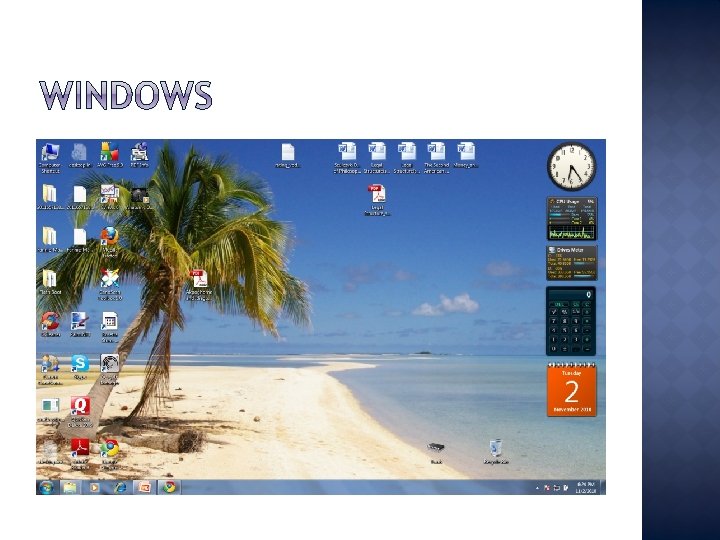 � Operating system – a program that runs on a computer and controls the hardware �Trend – strong graphical user interface �Users use a mouse to click on pictures or icons �Controls files, hard disk access, software, etc. �Connects computer to a network or internet �Requires security against viruses, hackers, etc. � Note – phones and handheld devices also have an operating system �Cellphones have Google Android �Ipad, Iphone, and Ipod have Apple’s