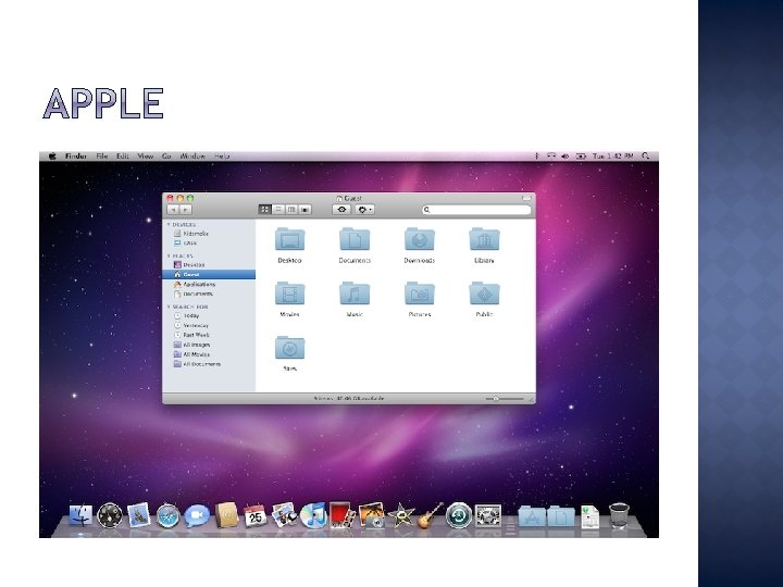 � Disadvantages �Apple operating system is only available for Apple computers Note – a group of hackers altered the OS X to run on computers with Intel processors Against the licensing agreement of Apple �Apple computers are expensive �Many games and software does not run on OS X Reinforces Microsoft’s monopoly power