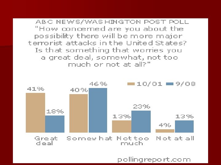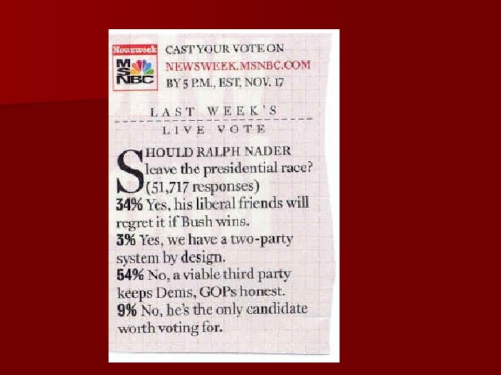 B. Role of Polls in American Democracy 1. We do not have to wait until elections to see if the public approves or disapproves of government’s course 2. Criticisms a. Politicians may pander to the polls b. Americans may take an opinion because they see other people doing it c. Exit Polls – Asking voters how they voted and why at select locations and announcing it prior to the end of election day d. Easy to manipulate by question order or wording