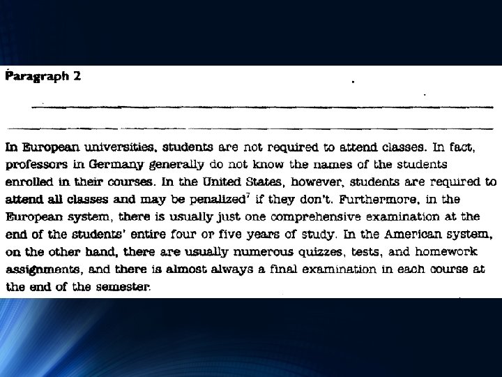 NEITHER TOO GENERAL NOR TOO SPECIFIC A topic sentence should be neither too general nor too specific. If it is too general, the reader cannot tell exactly what the paragraph is going to discuss. If it is too specific, the writer may not have anything left to write about in the rest of the paragraph. Think of a topic sentence as being like the name of a particular course on a restaurant menu. When you order food in a restaurant, you want to know more about a particular course than just ‘meat’ or ‘soup. ’ You wan to know generally what kind of meat it is. However, you do not necessarily want to know all of its ingredients.