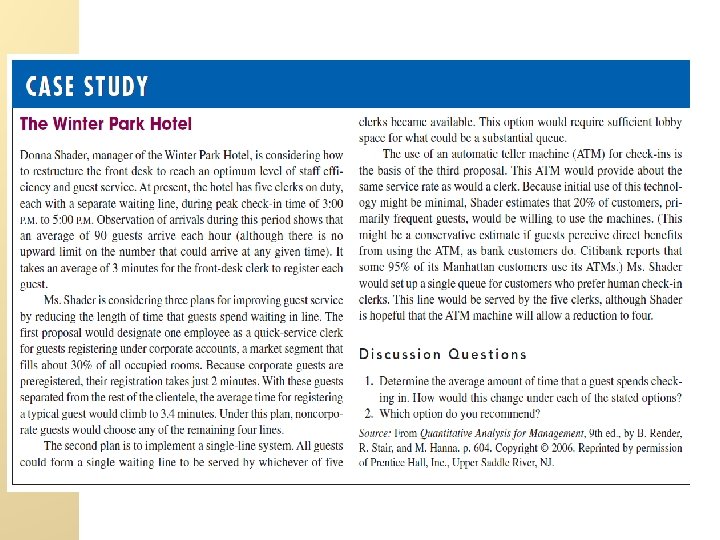� The Winter Park Hotel � Donna Shader, manager of the Winter Park Hotel, is considering how to restructure the front desk to reach an optimum level of staff efficiency and guest service. At present, the hotel has five clerks on duty, each with a separate waiting line, during peak check-in time of 3: 00 P. M. to 5: 00 P. M. Observation of arrivals during this period shows that an average of 90 guests arrive each hour (although there is no upward limit on the number that could arrive at any given time). It takes an average of 3 minutes for the front-desk clerk to register each guest. Ms. Shader is considering three plans for improving guest service by reducing the length of time that guests spend waiting in line. � The first proposal would designate one employee as a quick-service clerk for guests registering under corporate accounts, a market segment that fills about 30% of all occupied rooms. Because corporate guests are preregistered, their registration takes just 2 minutes. With these guests separated from the rest of the clientele, the average time for registering a typical guest would climb to 3. 4 minutes. Under this plan, noncorporate guests would choose any of the remaining four lines. � The second plan is to implement a single-line system. All guests could form a single waiting line to be served by whichever of five clerks became available. This option would require sufficient lobby space for what could be a substantial queue. � The use of an automatic teller machine (ATM) for check-ins is the basis of the third proposal. This ATM would provide about the same service rate as would a clerk. Because initial use of this technology might be minimal, Shader estimates that 20% of customers, primarily frequent guests, would be willing to use the machines. (This might be a conservative estimate if guests perceive direct benefits from using the ATM, as bank customers do. Citibank reports that some 95% of its Manhattan customers use its ATMs. ) Ms. Shader would set up a single queue for customers who prefer human check-in clerks. This line would be served by the five clerks, although Shader is hopeful that the ATM machine will allow a reduction to four. � Discussion Questions � 1. Determine the average amount of time that a guest spends checking in. How would this change under