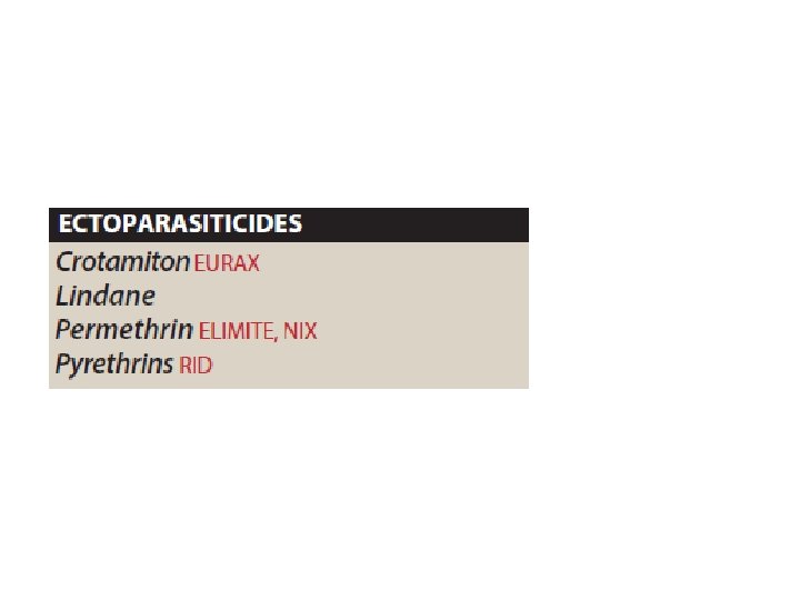 q Treatments for ectoparasitic infections. • Lindane [LIN-dane] is a cyclohexane derivative that is available as a cream or shampoo. • Lindane is toxic when absorbed by the parasite and is an effective pediculicide (kills lice) and scabicide. • Permethrin [per- METH-rin] is a synthetic pyrethroid that is neurotoxic to lice (1% nonprescription) and is effective in 5% concentration by prescription to treat scabies. ü Permethrin is preferred over lindane for the treatment of lice and scabies, since lindane can cause neurotoxicity. • Oral ivermectin is an alternative treatment for lice and scabies]. • Synergized pyrethrins (pyrethrins [pye-REE-thrins] with piperonyl butoxide [pye. PER-oh-nil bue-TOX-ide]) is a nonprescription product approved to treat head and pubic lice. • Pyrethrins are pesticides and piperonyl butoxide prevents the lice from metabolizing the pyrethrins, thereby enhancing their effect. • Due to a low risk of toxicity, this agent is considered a first-line treatment for pediculosis. • Crotamiton [crow-TAmi- ton] is a scabicide and has antipruritic functions. • Its mechanism of action is unknown.
