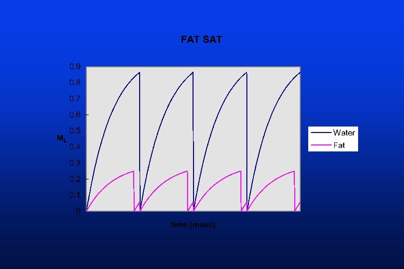 Chemical Saturation • similar to spatial saturation • narrow band RF pulse causes selective saturation of water or fat protons – “chem sat” – “fat sat” • compatible with many imaging sequences