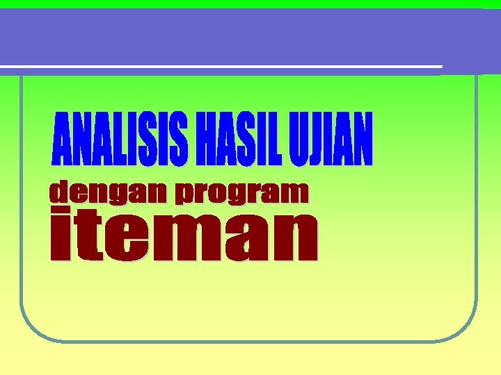 ITEMAN (Micro. CAT) Dikembangkan oleh Assessment Systems Corporation mulai 1982, 1984, 1986, 1988, 1993; mulai dari versi 2. 00 – 3. 50. Alamatnya Assessment Systems Corporation, 2233 University Avenue, Suite 400, St Paul, Minesota 55114, United States of America. Dipergunakan untuk: 1. menganalisis data file (format ASCII) (Notepad) melalui manual entri data atau dari mesin scanner, 2. menskor dan menganalisis data soal bentuk PG dan skala likert untuk 30. 000 siswa dan 250 butir soal, 3. menganalisis tes yang teridiri dari 10 skala (subtes) dan memberikan informasi tentang validitas butir dan relialilitas tes.