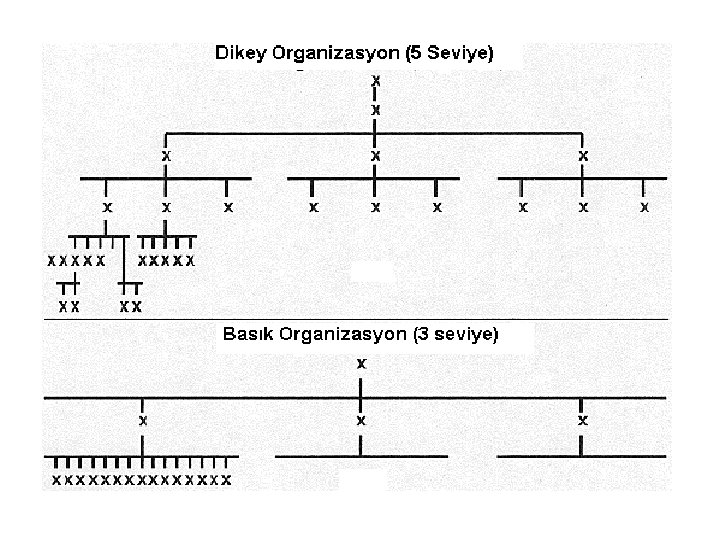 TKY’de Örgütsel Yapı • TKY uygulayan işletmeler verimlilik sağlamak, çalışmayan unsurları elemek ve dikey haberleşmeyi en etkin şekilde kullanmak amacıyla organizasyonlarını yalınlaştırmaya ve basık hale getirmeye çalışmaktadırlar. Burada belirtilen yalın organizasyon kavramı, sadeleştirmeyi ve basitleştirmeyi gerçekleştirmiş olan, dikey organizasyon yerine yatay organizasyon yapısını ikame etmiş, aynı zamanda gereksiz ve katma değer yaratmayan fonksiyonları ve iş süreçlerini ortadan kaldırmış bir işletme yapısını tanımlamaktadır. Kademe azaltma, işletmenin en alt kademesi ile en üst kademesi arasındaki mesafeyi kısaltma işlemidir.