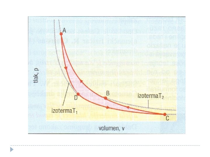 Carnotov kružni proces W = WAB + WBC + WCD + WDA p = Q 1 + (- U) + (- Q 2) + U A W = Q 1 – Q 2 T 2 D B T 1 C V Q 12 WAB = Q 1 WCD = - Q 2 WBC = - U WDA = U