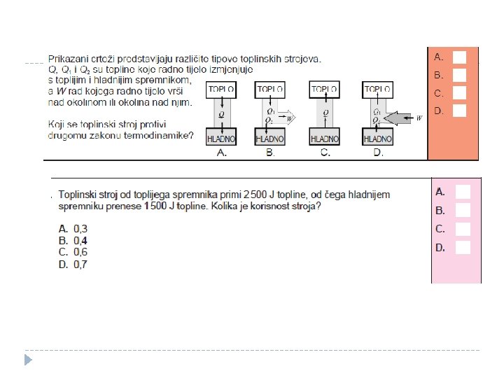 � Nastavni � Opća plan i program gimnazija – 2. razred (2 sata tjedno) 1. sat: Toplinski strojevi (pokus, djelotvornost, Carnotov kružni proces: u općoj gimnaziji je prošireni sadržaj? ) 2. sat: Obrnuti Carnotov proces, rashladni stroj, primjena (motori s unutrašnjim sagorijevanjem, ) � Strukovna četverogodišnja škola: - četverogodišnji program fizike ( 3 sata tjedno): (elektrotehničar) – 3. razred � Kao gimnazija (Carnotov kružni proces se obrađuje) + 3. sat - motori s unutrašnjim sagorijevanjem � dvogodišnji program fizike (2 sata tjedno) (Tehničar za mehatroniku – - u prvom razredu 1. sat za obradu Toplinskih strojeva - Obrazovni ishodi: poznavati izraz za korisnost toplinskog stroja, osnovni dijelovi toplinskog stroja