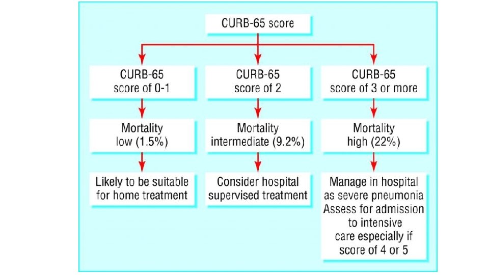 CURB 65 • Confusion (Konfüzyon) • Urea (Üre) > 42. 8 mg/d. L (BUN ölçülüyorsa > 20 mg/d. L [7 mmol/l ]) • Respiratory rate (Solunum Sayısı) ≥ 30/dk. • Blood pressure (Kan basıncı) (Sistolik<90 mm. Hg veya Diastolik≤ 60 mm. Hg) • Yaş ≥ 65 yıl * Her bir ölçütün varlığı 1 puan olarak hesaplanır