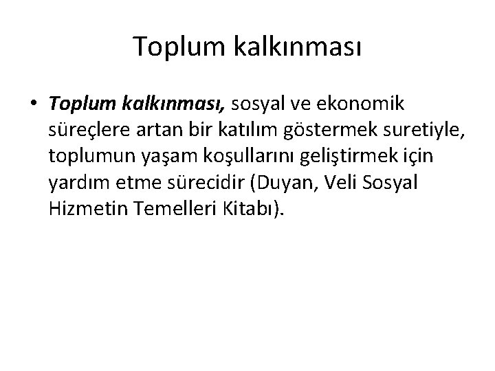 Toplum kalkınması • Toplum kalkınması, sosyal ve ekonomik süreçlere artan bir katılım göstermek suretiyle, toplumun yaşam koşullarını geliştirmek için yardım etme sürecidir (Duyan, Veli Sosyal Hizmetin Temelleri Kitabı).