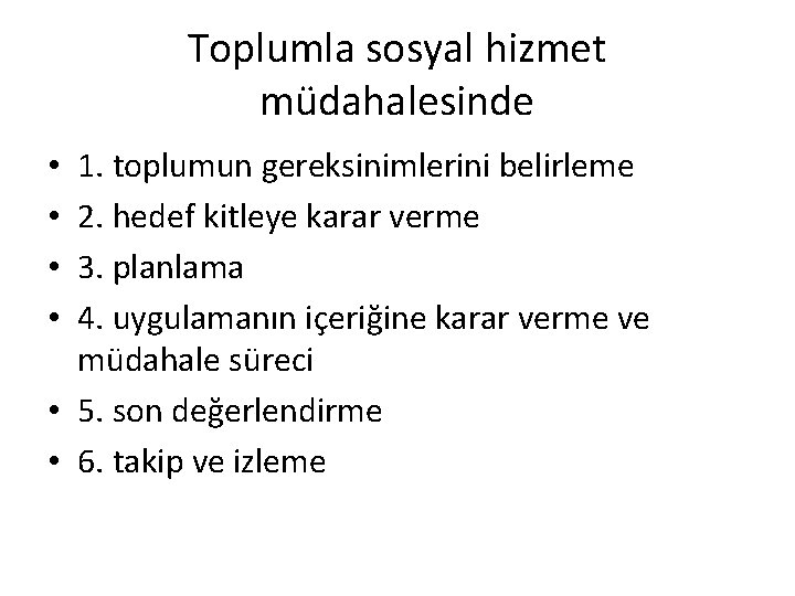 Toplumla sosyal hizmet müdahalesinde 1. toplumun gereksinimlerini belirleme 2. hedef kitleye karar verme 3. planlama 4. uygulamanın içeriğine karar verme ve müdahale süreci • 5. son değerlendirme • 6. takip ve izleme • •