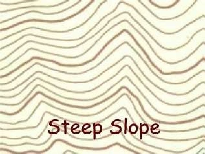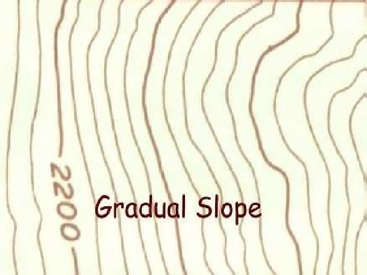 Parts of a Topographic Map 1. Contour Lines • A line that connects points of equal elevation • Used to show features of the land • Spacing of lines depends on slope of land – Close lines = steeper slope – Farther apart = gentle slope