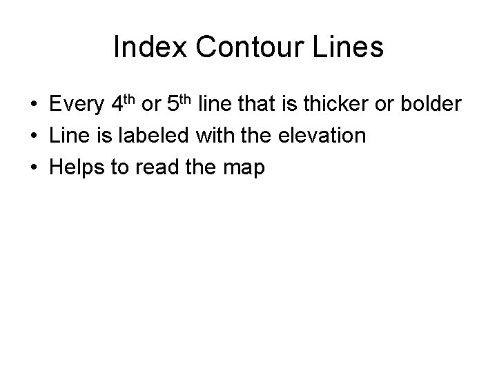 Index Contour Lines • Every 4 th or 5 th line that is thicker or bolder • Line is labeled with the elevation • Helps to read the map