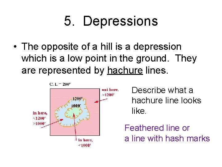 5. Depressions • The opposite of a hill is a depression which is a low point in the ground. They are represented by hachure lines. Describe what a hachure line looks like. Feathered line or a line with hash marks