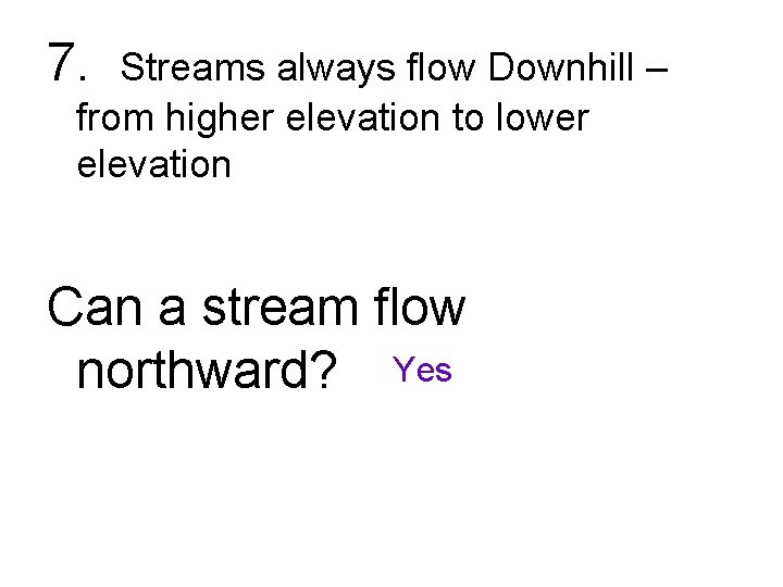 7. Streams always flow Downhill – from higher elevation to lower elevation Can a stream flow northward? Yes