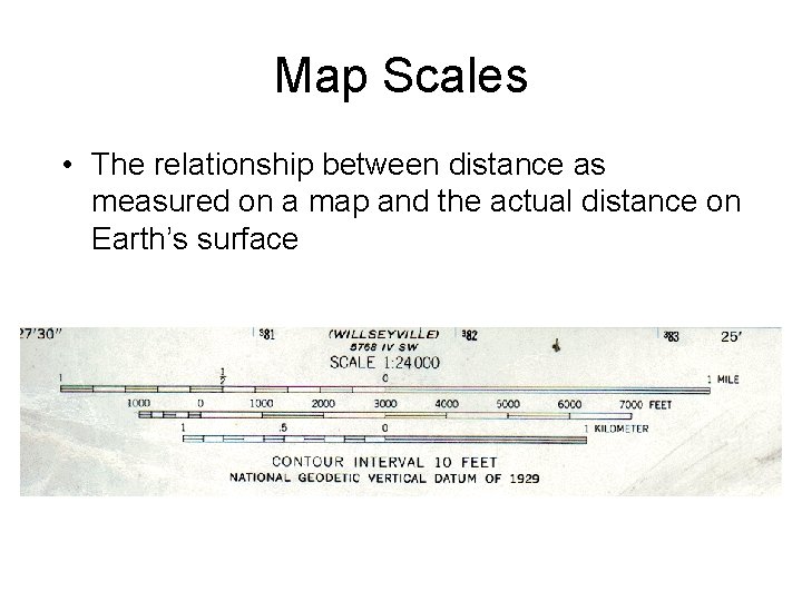 Map Scales • The relationship between distance as measured on a map and the actual distance on Earth’s surface