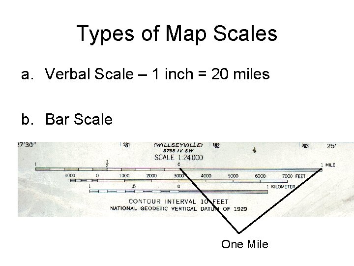 Types of Map Scales a. Verbal Scale – 1 inch = 20 miles b. Bar Scale One Mile