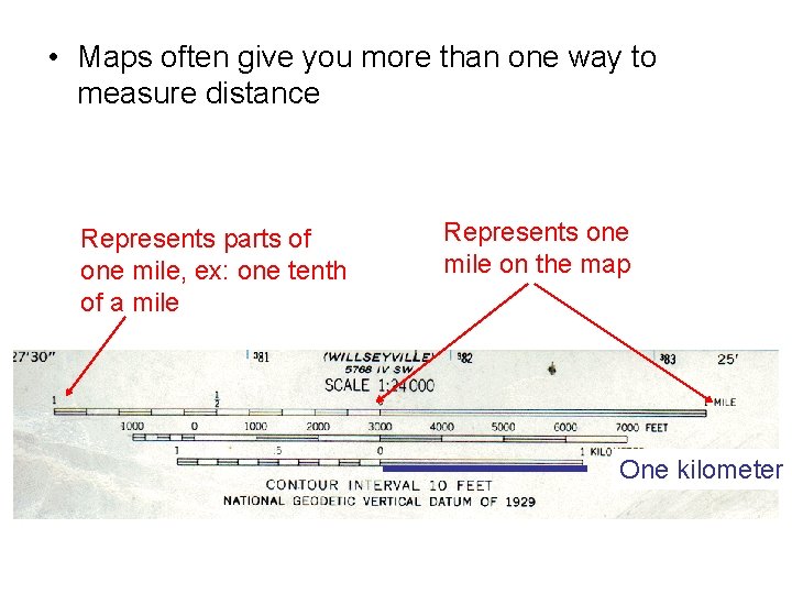 • Maps often give you more than one way to measure distance Represents parts of one mile, ex: one tenth of a mile Represents one mile on the map One kilometer