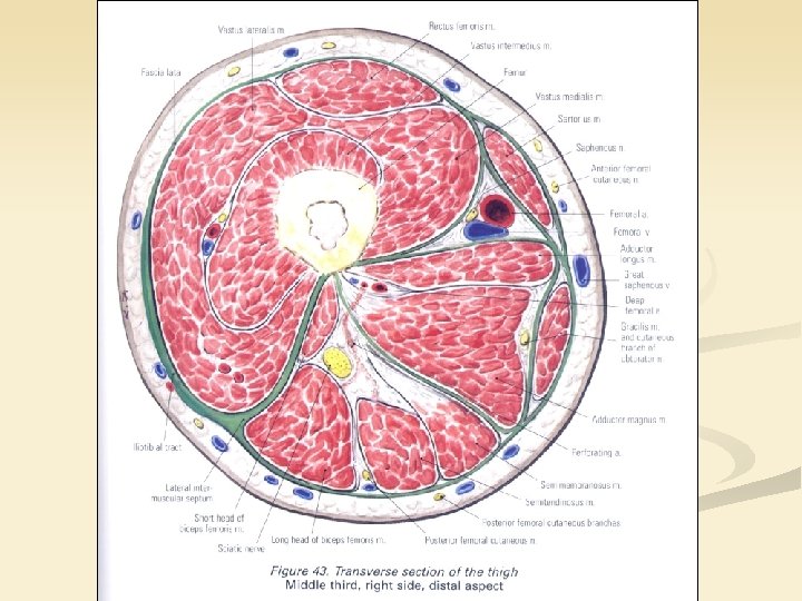 Anterior femoral region Cutaneous innervation is provided by the lateral and anterior femoral cutaneous nerves, medially the cutaneous branch of obturator nerve should be mentioned. All these are found superficial to the fascia lata. The main contents of the region are the extensors of the tigh. Femoral artery and vein together with the saphenous nerve arising from the femoral nerve as its longest sensory branch enter the adductor canal at the inferior corner of the femoral triangle enclosed by the inguinal ligament, the Sartorius and the Adductor longus muscles. Adductor canal is bounded by the vastoadductorial membrane, Vastus medialis and Adductor longus and magnus muscles.