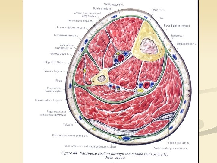 Posterior crural region Superficially the small saphenous vein ascends along the sural nerve on the lateral aspect of the leg. Between the superficial and deep flexors the posterior tibial artery and vein as well as the tibial nerve is present. The most important is the „abnormal” site of origin of the Flexor digitorum longus muscle: as it arises from the posterior surface of the tibia, first has to cross the tendon of Tibialis posterior (above the medial ankle – crural chiasm) then Flexor hallucis longus tendon already on the sole (plantar chiasm).
