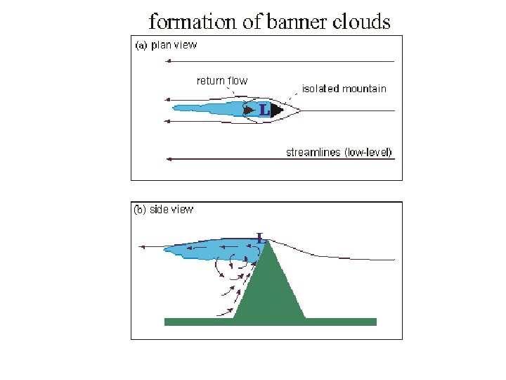 Banner or Cap Clouds • A cloud plume often observed to extend downwind from isolated, sharp, often pyramid-shaped mountain peaks, even on otherwise cloud-free days. • Air ascends in an upslope flow, condenses, and forms a triangular- shaped cloud, the banner cloud, to the lee of the peak. • Physics not well-known