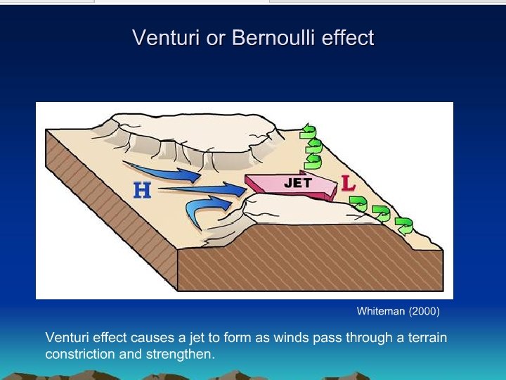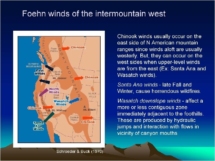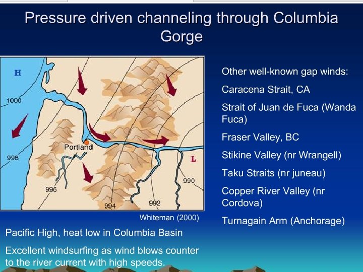 Topography: Regional Scale • Mountain Barrier Effect • Prevailing winds interact with mtns • They must accelerate to go over mtns, – Increasing wind speed on peaks • The wind “look” for low places to flow – Increasing wind speed in passes