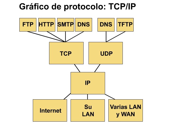 Este gráfico ilustra algunos de los protocolos comunes especificados por el modelo de referencia TCP/IP. En la capa de aplicación, aparecen distintas tareas de red. FTP: File Transfer Protocol (Protocolo de transferencia de archivos) HTTP: Hypertext Transfer Protocol (Protocolo de transferencia de hipertexto) SMTP: Simple Mail Transfer Protocol (Protocolo de transferencia de correo simple) DNS: Domain Name System (Sistema de nombres de dominio) TFTP: Trivial File Transfer Protocol (Protocolo de transferencia de archivo trivial) El modelo TCP/IP enfatiza la máxima flexibilidad, en la capa de aplicación, para los creadores de software. La capa de transporte involucra dos protocolos: el protocolo de control de transmisión (TCP) y el protocolo de datagrama de usuario (UDP). La capa inferior, la capa de acceso de red, se relaciona con la tecnología específica de LAN o WAN que se utiliza. En el modelo TCP/IP existe solamente un protocolo de red: el protocolo Internet, o IP, independientemente de la aplicación que solicita servicios de red o del protocolo de transporte que se utiliza. Esta es una decisión de diseño deliberada. IP sirve como protocolo universal que permite que cualquier computador en cualquier parte del mundo pueda comunicarse en cualquier momento.
