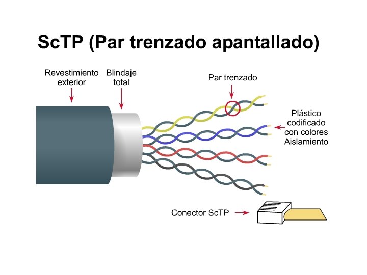 El cable de par trenzado blindado (STP) combina las técnicas de blindaje, cancelación y trenzado de cables. Cada par de hilos está envuelto en un papel metálico. Los 4 pares de hilos están envueltos a su vez en una trenza o papel metálico. Generalmente es un cable de 150 ohmios. Tal como se especifica en las instalaciones de redes Ethernet, el STP reduce el ruido eléctrico, tanto dentro del cable (acoplamiento par a par o diafonía) como fuera del cable (interferencia electromagnética [EMI] e interferencia de radiofrecuencia [RFI]). El cable de par trenzado blindado comparte muchas de las ventajas y desventajas del cable de par trenzado no blindado (UTP). El cable STP brinda mayor protección ante toda clase de interferencias externas, pero es más caro y es de instalación más difícil que el UTP. Un nuevo híbrido de UTP con STP tradicional se denomina UTP blindado (Sc. TP), conocido también como par trenzado de papel metálico (FTP). Sc. TP consiste, básicamente, en cable UTP envuelto en un blindaje de papel metálico. Generalmente el cable es de 100 ó 120 ohmios.