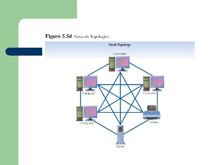 Ring topology l A ring network is one where all workstations and other devices are connected in a continuous loop. There is no central server