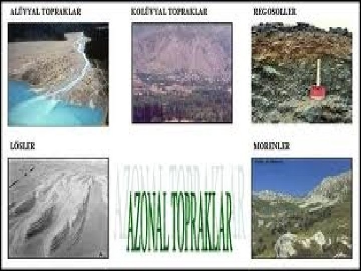 B. İNTRAZONAL TOPRAKLAR � Bu topraklar, ülkemizde aşınmanın devamlı olduğu dağlık alanlarda ve birikmenin hüküm sürdüğü alüvyal ovalarımızda ve dağların eteklerinde yaygın olarak bulunmaktadır. � Bu topraklar ana kayanın etkisi altındaki topraklardır. Şöyle ki ana kaya kulu ise toprak kumlu ana kaya tuzlu ise toprakta tuzludur.