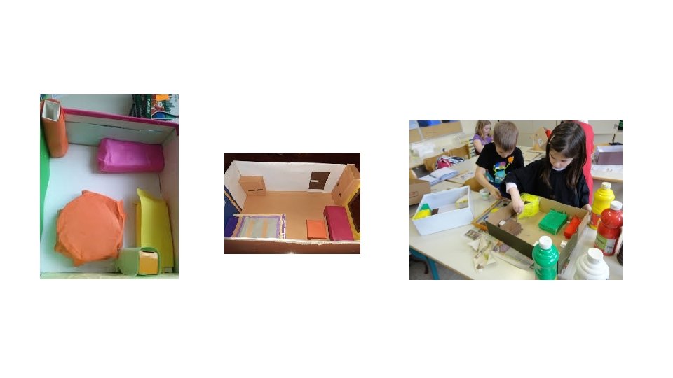 LUM, Arhitektura: Oblikovanje notranjega prostora • Včeraj si bral/a in poslušal/a pravljico Šivilja in škarjice. • Sedaj boš iz odpadnih škatlic in papirja ter kartona, lahko uporabiš tiste materiale, ki jih najdeš doma, oblikoval/a notranji prostor hiške – sobo - šivilje iz pravljice tako, kot si ga predstavljaš. • Oblikuješ lahko tudi človeške figure iz malo tršega papirja, kartona, ki jim spodaj pustiš velike podplate in jih boš zalepil/a na tla sobe oziroma hiške. • Na naslednji strani imaš nekaj primerov otroškega ustvarjanja, a jaz verjamem, da si ti še ustvarjalnejši/a. • Delo opravi do konca tega tedna, pošlji mi kakšno fotografijo, ko boš zaključil/a.