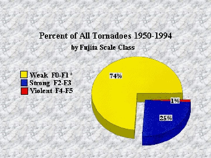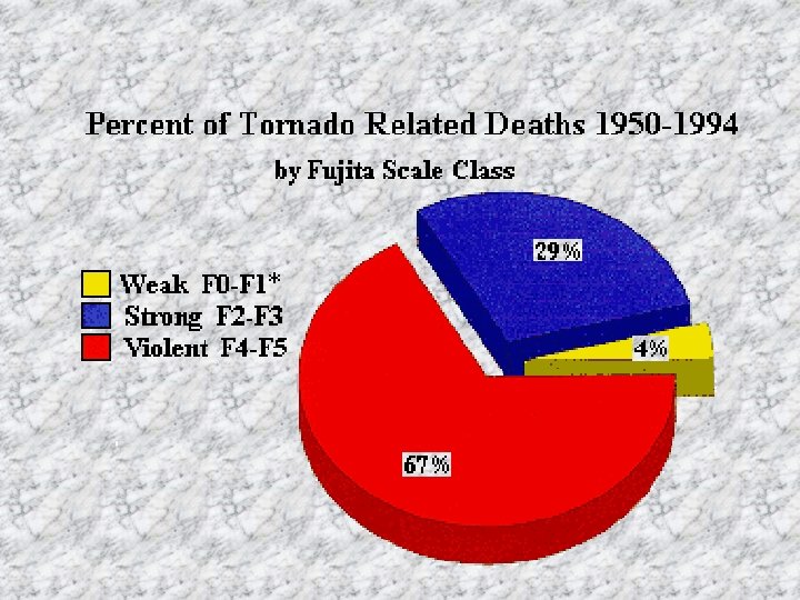 • Less than 2 percent of all tornadoes reach the 200+ MPH violent category. • Most violent tornadoes only produce home-leveling damage within a very small area • Less than 5 percent of the 5, 000 affected homes in Wichita Falls, Texas were leveled by this massive 1979 tornado.